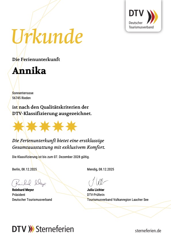 Sonnenterrasse 12, 56745 Rieden (D)  –  100 m2 Wohnfläche, DTV 5 Sterne Ferienhaus